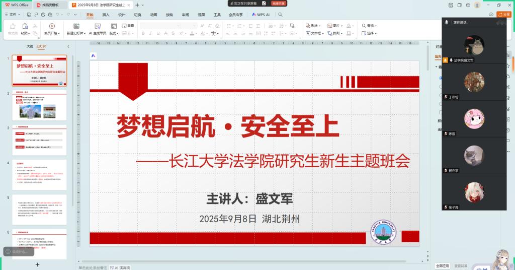 (通讯员 肖芳)9月8日,学院以“梦想启航·安全至上”为主题,召开2025级研究生新生线上主题班会,由辅导员盛文军主讲,为新生入学答疑解惑。会上,盛文军明确新生报到时间为9月13日下午-9月14日,地点在东校区文科大楼B区1110室,学校在荆州火车站、长途客运站设接站点,校园所有门均可进入。同时,他详细说明报到前需加入年级群改备注、用“今日校园”APP完成认证、备齐身份证等证件,提醒新生提前自行缴费,并就报到时的注意事项着重进行了强调。针对经济困难新生,学院将凭相关证明办理“绿色通道”。此外,对新生报到时的安全进行了详细的讲解,提醒新生注意安全。