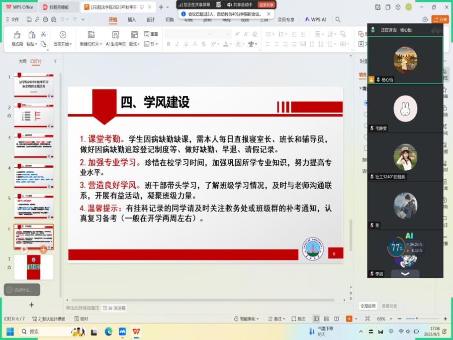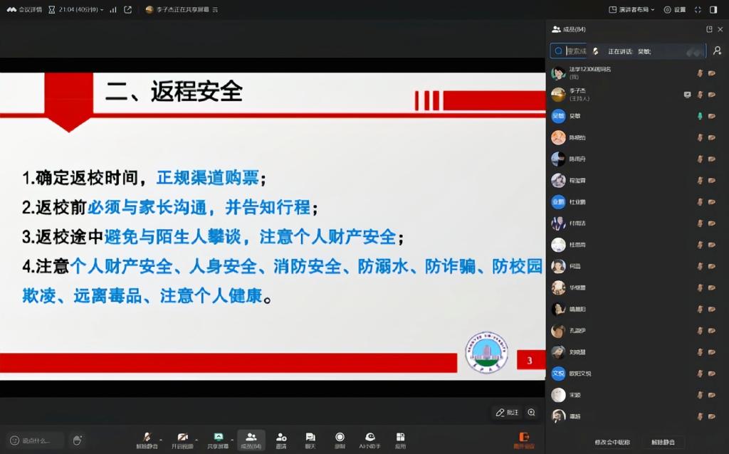 (通讯员 卢鸿彬)为帮助全体本科生、研究生快速调整开学状态,筑牢校园安全防线,保障新学期教学与管理工作平稳开局,9月2日,jdb电子中国官方网站组织全院本科生与研究生班级依托腾讯会议等线上平台,同步开展开学安全教育主题班会。