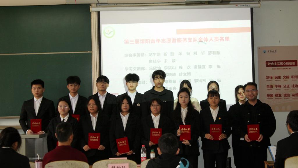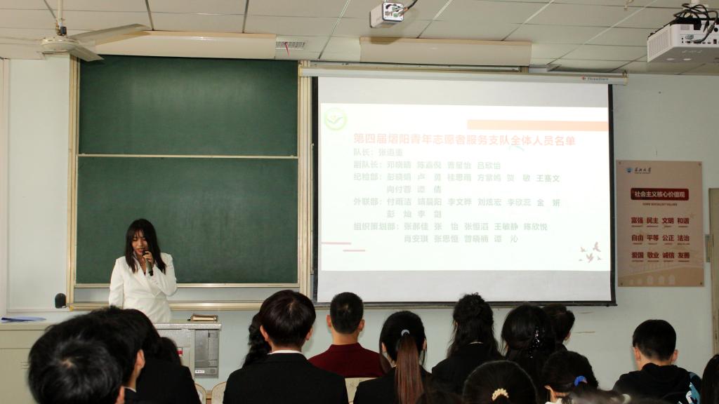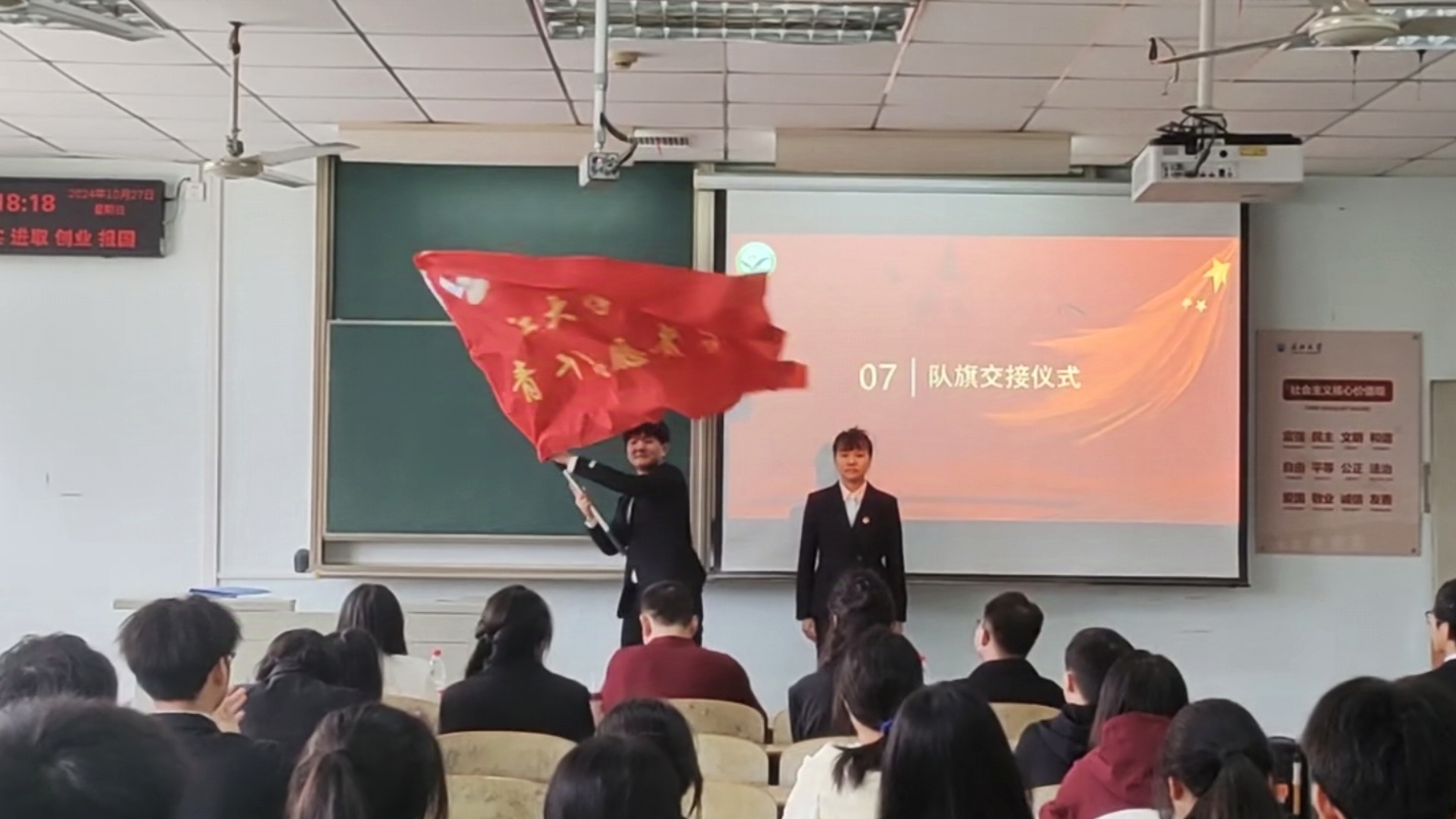 大会进行第五项,举行庄严的队旗交接仪式,飘扬的队旗象征着青年志愿者们的使命与荣耀。现任队长张道重也在接下队旗后对下一步工作作出明确规划,指出将继续秉承“服务社会、锻炼自我、传播法治、弘扬正气”的宗旨,进一步创新志愿服务模式,拓宽服务领域,提升服务质量,努力将jdb电子中国官方网站青年志愿者服务队打造成为一支更加专业化、规范化、有影响力的志愿服务队伍。大会进行第六项,吴敏老师宣读jdb电子中国官方网站熠阳青年志愿者支队新成员名单,对新成员的加入表示热烈欢迎,希望全体队员能够在未来一年的工作中踔厉奋发、勇毅前行。