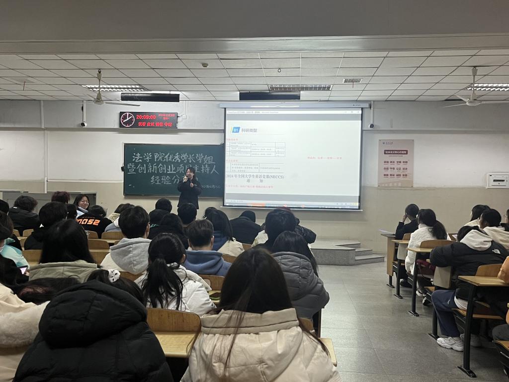 最后,袁玫学姐向同学们重点介绍了大学生创新创业计划,她以自己出色的获奖经历吸引同学们的注意。她分别从参赛目的、申报类型、具体要求、相关政策向同学们提出建议,着重介绍了提交流程、项目和人员选择、项目计划书、项目立项、项目答辩、项目结项等具体流程和注意事项。