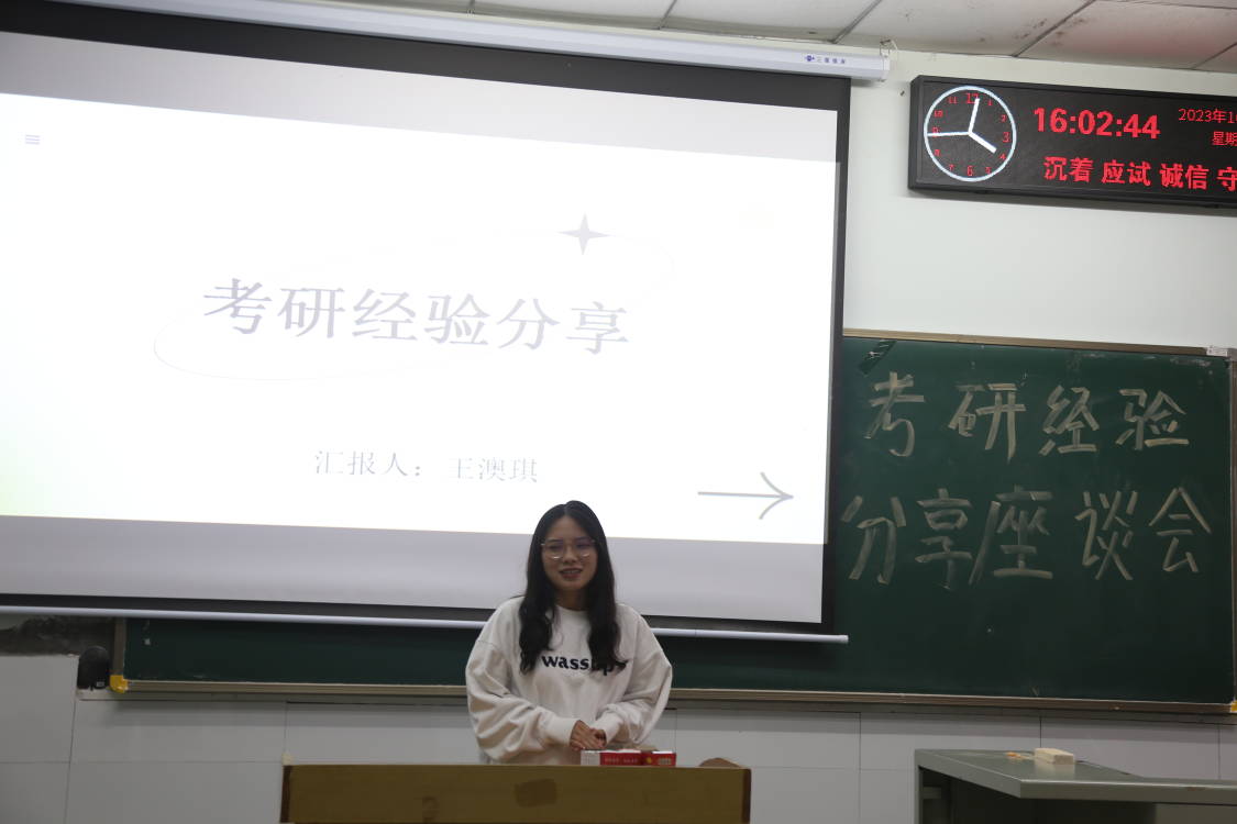 在活动过程中,主讲人王澳琪主要从考研时间安排、前期择校以及情绪调节三个方面向同学们分享了自己的考研经验。对于考研时间安排,王澳琪强调同学们应当提前规划并制定科学合理的学习计划;在选择学校方面,王澳琪分享了自己的经验,指出考研的成功是初试和复试共同作用的结果,因此,初试成绩优秀的同学可以优先选择初试占比高的院校,而复试表现优秀的同学则可以优先选择复试占比高的院校;在情绪调节方面,王澳琪建议同学们要多给自己积极的暗示,以减少负面情绪的影响,并保持良好的心态和健康的生活习惯,做到劳逸结合。