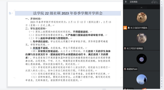 为做好2023年春季开学工作,落实学生平安返校的保障工作,jdb电子中国官方网站研究生开展了线上主题班会。会议由研究生各班班长主持,jdb电子中国官方网站全体研究生参会。