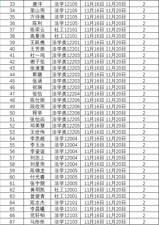 根据学校要求,2022年11月14日——11月20日(第十二周)组织全体本科生进行每日“辅导猫”打卡。经分管辅导员、学工助理、班干部多次提醒,仍有67名同学未在规定时间内完成打卡,具体未打卡次数及日期如下:(表格显示)