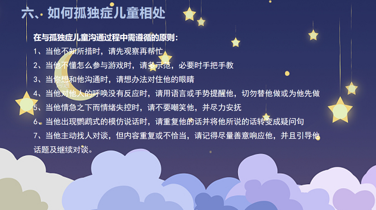 每一位自闭症患儿都是一颗闪烁的星星,愿每个“星星的孩子”都能触摸到广阔的天空!活动结束后,同学们表示:在今后的学习生活中,会主动的运用所学去帮助自闭症儿童,每个人都应该拥有广阔的天空。