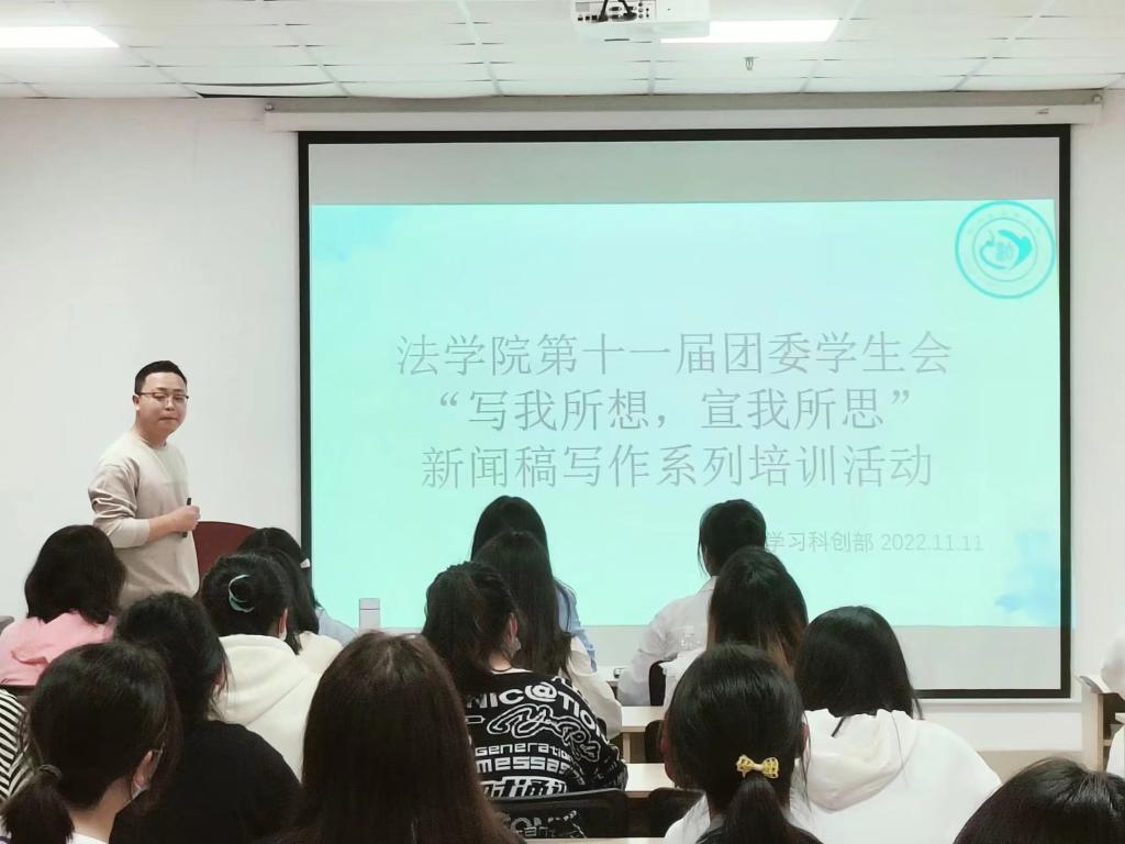 (通讯员 胡曦禾 童晶晶)2022年11月11日晚18时,jdb电子中国官方网站开展了新闻写作培训系列活动第一期。本次培训采用线上线下相结合的方式,线下会议于文科大楼1011会议室进行,辅导员盛文军在培训中进行了详细教学,我院第十一届团委学生会全体干事和其他班委参加。