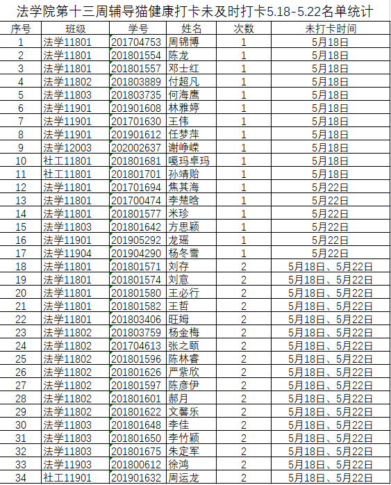 根据学校要求,2022年5月18日、5月22日(第十三周)组织全体本科生进行每日“辅导猫”打卡。经分管辅导员、学工助理、班干部多次提醒,仍有34名同学未在规定时间内完成打卡,具体未打卡次数及日期如下:(表格显示)