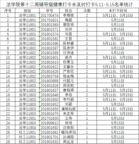 根据学校要求,2022年5月11日、5月15日(第十二周)组织全体本科生进行每日“辅导猫”打卡。经分管辅导员、学工助理、班干部多次提醒,仍有28名同学未在规定时间内完成打卡,具体未打卡次数及日期如下:(表格显示)
