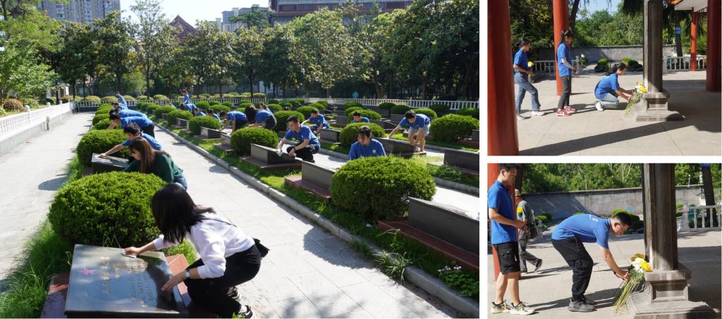 春风送花表哀思,青松滴翠寄深情。在安静而庄重的气氛中,同学们有序为革命烈士敬献鲜花,鞠躬默哀、清洁墓碑。