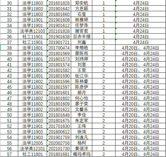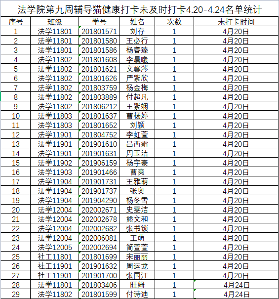 根据学校要求,2022年4月20日、4月24日(第九周)组织全体本科生进行每日“辅导猫”打卡。经分管辅导员、学工助理、班干部多次提醒,仍有57名同学未在规定时间内完成打卡,具体未打卡次数及日期如下:(表格显示)