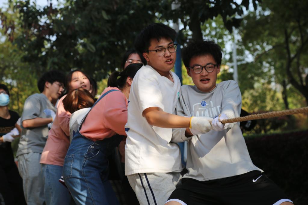 周晓峰老师致开幕辞并宣布活动正式开始,各项比赛依次进行,在“踩气球”、“两人三足”等项目中,各参赛队员紧密配合,展现出顽强拼搏的意志和团结协作的能力。在拔河比赛中,各参赛队员奋力拼搏,团结一心,拉着一条绳,拧成一股劲,将现场活动氛围推到了高潮!