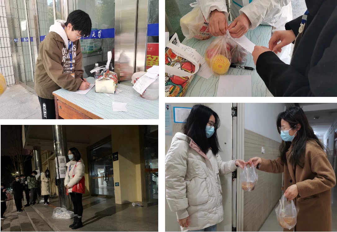 志愿者们热情高涨,挺身而出。在连续两个星期的志愿服务工作中,志愿者用实际行动展现着自己的无悔青春,不辞辛劳地为隔离点的学生送餐、为在寝室上网课的学生取快递,尽可能地满足学生们的日常生活需求。
