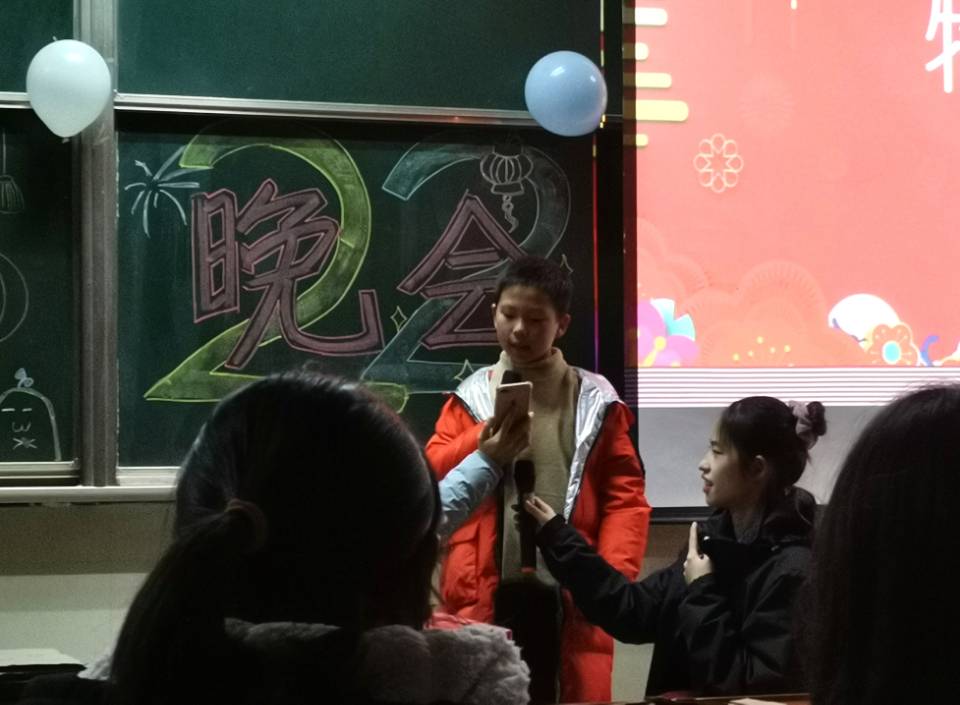 晚会在暖场视频中拉开了帷幕。此次晚会共有五个节目,包括神秘的魔术表演,火热的舞蹈节目,精彩的歌曲演唱等。首先,由孙宇军带来的魔术表演点燃了现场的气氛,凭空出现的玫瑰花,纸牌的重现,引来了同学们一阵阵的欢呼;赵紫怡同学带来的歌曲演唱《贝加尔湖畔》,更是让温暖的气息弥漫全场;孙越男同学一首抒情外文歌曲《Gone》,成功地俘获了在场观众的心;朱镘潮同学更是展现了极为专业的演唱能力,一首《关键词》将晚会推向高潮。素装锦衣翩然而至,由邓茗芳、甘宇婷带来的,舞蹈串烧《芒种》获得了台下观众的接连喝彩。在精彩绝伦的节目中,晚会还穿插了“心有灵犀”、逢3就过”、“踩气球”等游戏活动,现场氛围欢腾而热烈。最后,全体师生一起合唱班歌《夜空中最亮的星》,在温暖和谐的氛围中元旦晚会圆满结束。