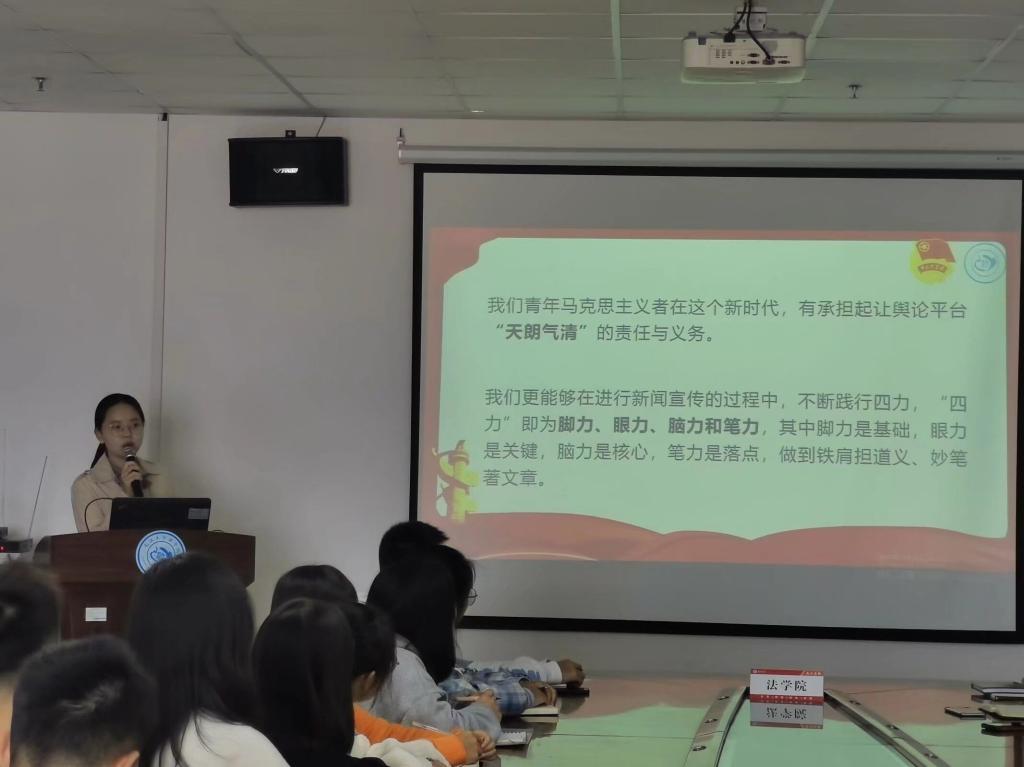徐程从“听、思、讲、写”四个方面总结了新闻稿写作的学习锻炼方法。本次培训以马克思主义新闻观为出发点,介绍了新闻稿写作、新闻通讯材料写作的方法与技巧,指出了马克思主义新闻观对学生及学校的意义。培训会上,主讲人以新闻示例材料以及错例修改材料为指引,引导同学们积极思考,提升了同学们新闻写作的基本素养。