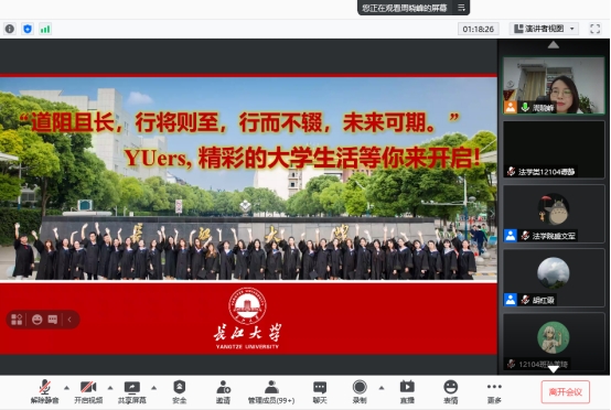 会议最后为自由发言和提问环节。法学类12103班韩畅同学表达了对大学生活的期望以及大学四年的规划。同学们针对来校报到及学习生活等方面也提出了很多问题,老师们在线为同学们一一解答,为新生报到做好了充足准备。