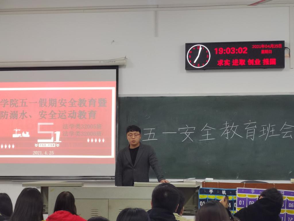 (通讯员:胡智豪)为提高学生自我防范意识,增强学生假期安全意识,我院以班级为单位先后召开“五一”安全教育主题班会。4月25日晚7时,法学类32005、32006班“五一”安全教育班会于西校区7教406教室召开。辅导员盛文军老师参加并主持本次班会。