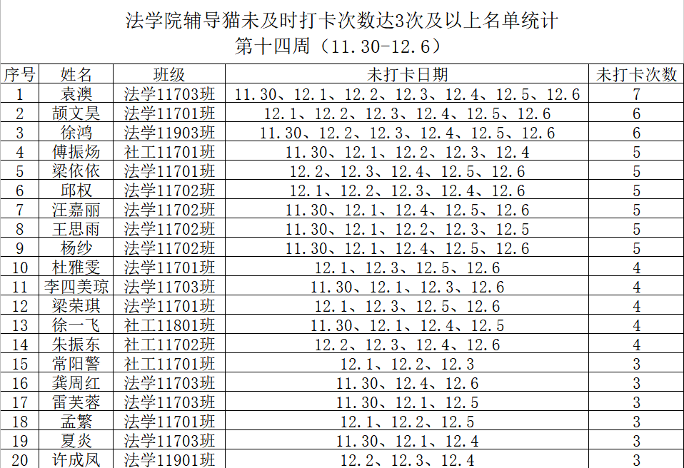 根据学校要求,2020年11月30日-12月6日组织全体本科生进行每日“辅导猫”打卡。经分管辅导员、学工助理、班干部多次提醒,仍有20名同学未在规定时间内完成打卡,具体未打卡次数及日期如下:(表格显示)