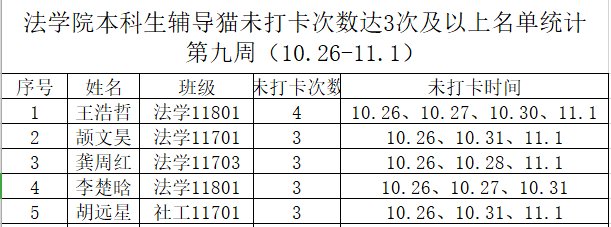根据学校要求,2020年10月26日-11月1日组织全体本科生进行每日“辅导猫”打卡。经分管辅导员、学工助理、班干部多次提醒,仍有5名同学未在规定时间内完成打卡,具体未打卡次数及日期如下:(表格显示)