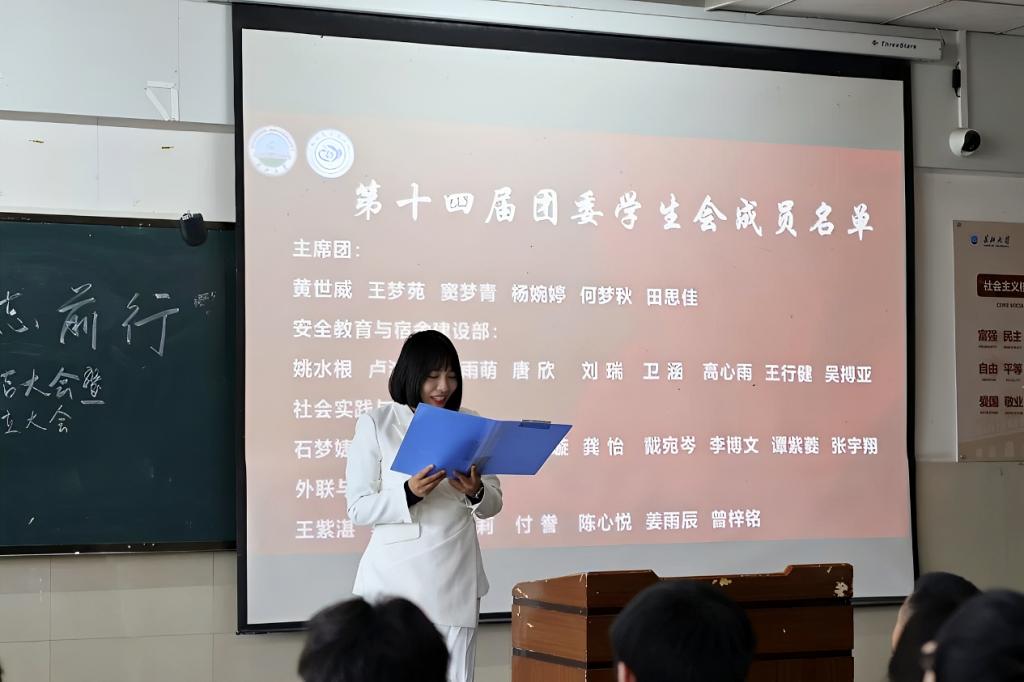 第六项议程中,第十四届团委学生会新干事代表龚怡上台发言。她以 “扎根泥土听真实声音,深入具体践知行合一” 为行动纲领,用昂扬的精神风貌与铿锵有力的话语,传递出新一代学生会成员的朝气、活力与实干决心,赢得现场阵阵掌声。