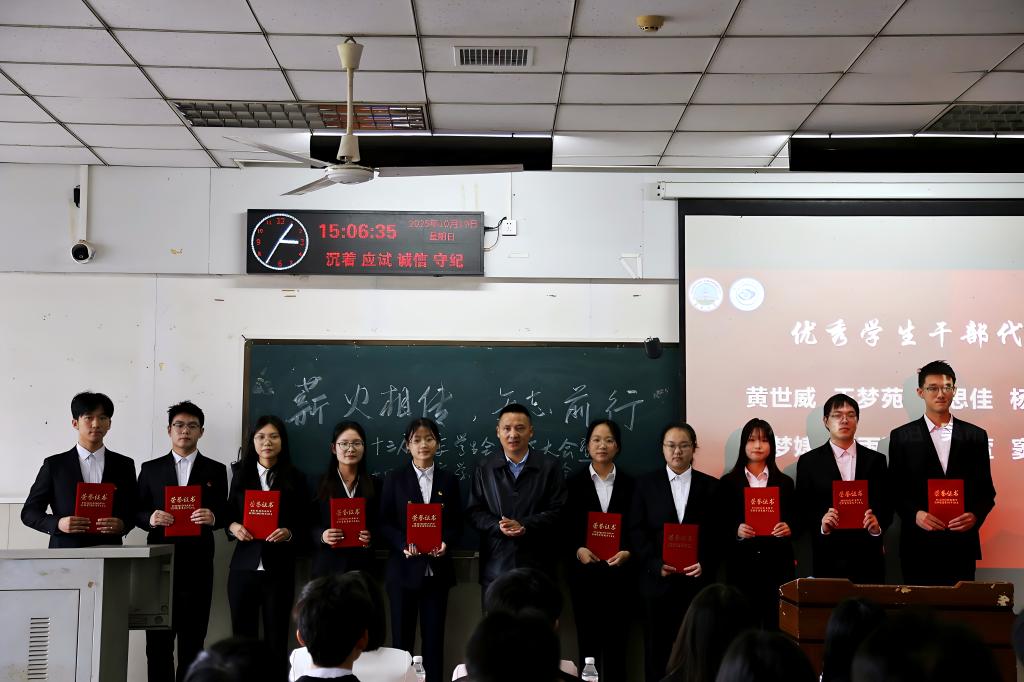 伴随着庄严的国歌声,大会正式拉开帷幕。会议首项议程为表彰先进 —— 李华成院长为第十三届团委学生会中的优秀学生干部颁发荣誉证书,在肯定他们过往工作突出成果的同时,也向全体成员传递了对学生会工作的认可与期许。