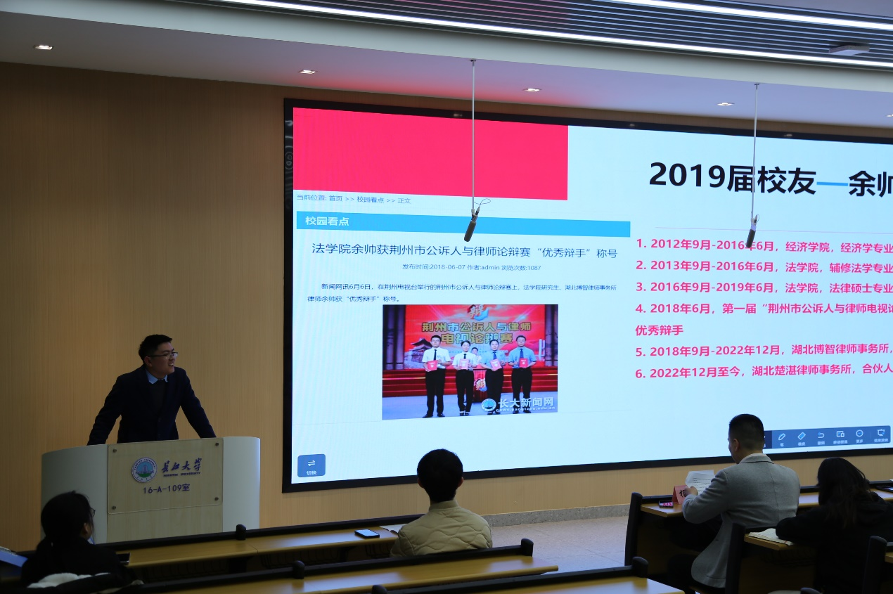 接着,曾经辅修法学专业的优秀校友——湖北楚湛律师事务所合伙人余帅律师,分享了他在jdb电子中国官方网站辅修、深造、成长的心得体会。他的经验之谈,为新同学们提供了可资借鉴的范例和启示,点亮了求学之路,坚定了职业信心。