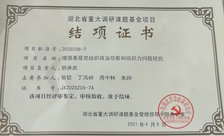 学校是湖北基层治理的重要探索者。学校基层治理团队完成了省委重大调研课题《增强基层党组织政治功能和组织力问题研究》(JX202006-7A)和省政法委交办的调研课题《湖北地方性法规融入司法问题研究》(HBFXH18-304);在中央国家机关媒体《人民政协报》刊发了《如何消除电动自行车火灾威胁?——技术赋能与法治保障要两手抓、两手硬》、《发展共享电动自行车需包容审慎监管》等基层治理建言文章6篇;团队是荆州自治、法治、德治三治融合暨“金豆激励”工程的倡议者和评估方。