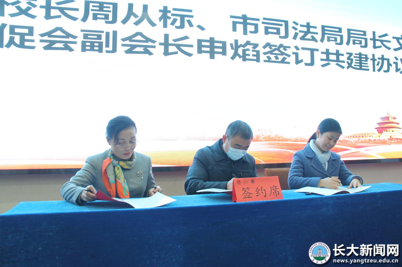 副校长周从标、市司法局局长文玉莲、市贸促常务副会长申焰代表三家共建单位签订共建协议。在热烈的掌声中,朱业宏、黄庭松、林红共同为荆州市涉外公共法律服务中心揭牌,校、市领导为荆州市涉外公共法律服务中心的部分律师代表颁发了聘书。