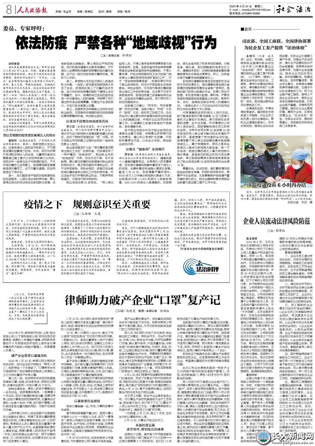 全国政协机关报《人民政协报》2020年03月24期第8版暨社会法治版以“让湖北健康码全国畅行”为题全文刊登jdb电子中国官方网站李华成博士的建言献策文章。
