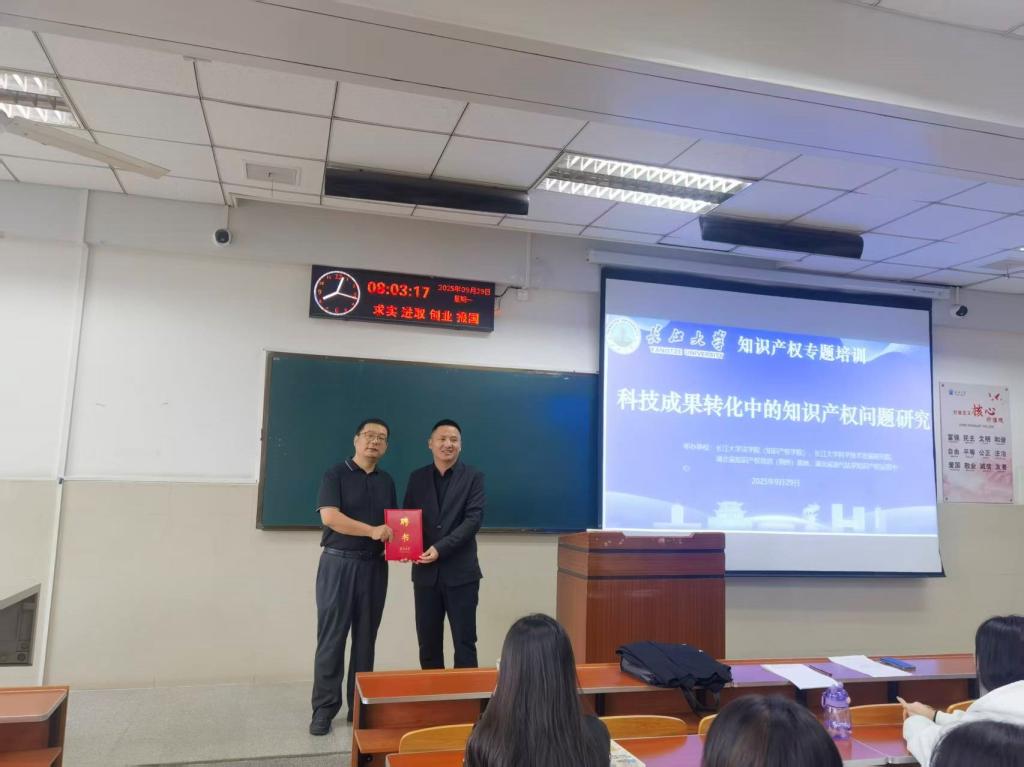 (通讯员 胡骑兵)9月29日上午,jdb电子中国官方网站2025年度第五场学术讲座——“科技成果转化中的知识产权问题”在12教403教室成功举行。讲座特邀中南财经政法大学知名专家何华教授担任主讲,校科学技术发展研究院副院长郝勇、jdb电子中国官方网站副教授胡骑兵出席,jdb电子中国官方网站全体研究生及法律专业本科生参加。讲座由jdb电子中国官方网站院长李华成主持。