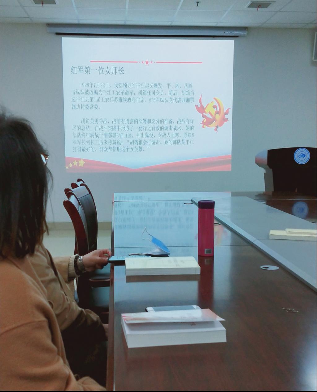 之后,由王康同志继续带领大家学习中国工农红军第一位女司令、女师长——胡筠的先进事迹,大家深受鼓舞,励志要向胡筠同志学习,发挥党员的先锋模范作用。