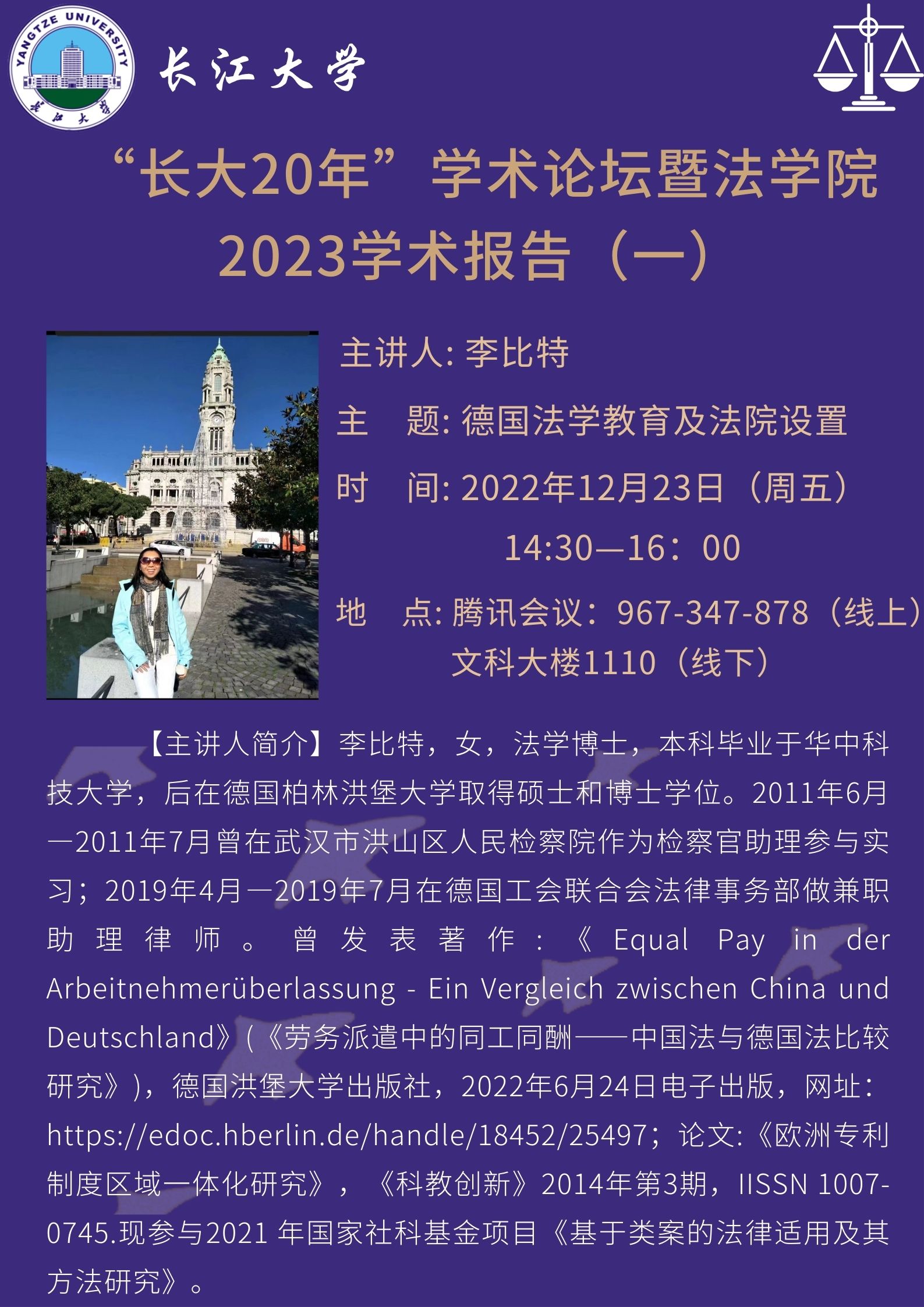 主 题: 德国法学教育及法院设置 时间: 2022年12月23日 (周五)14:30-16: 00