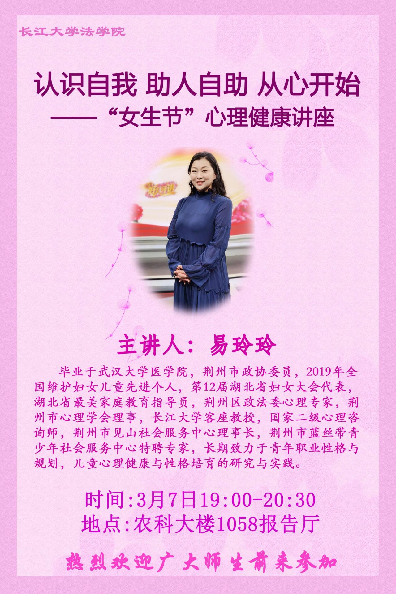 题目:认识自我 助人自助 从心开始——“女生节”心理健康讲座
