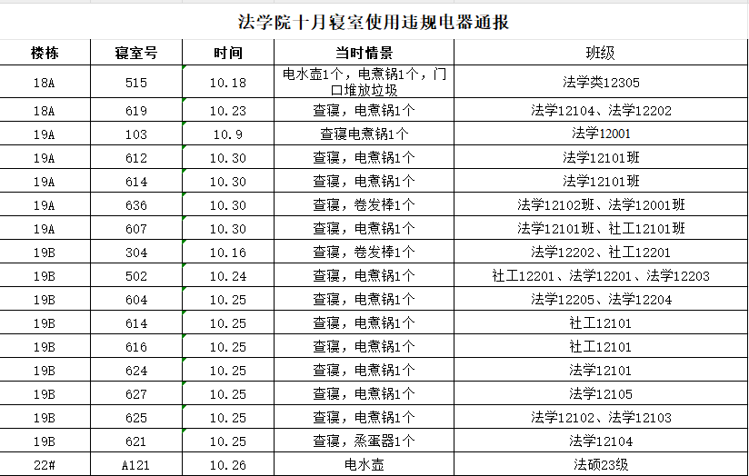 根据学校十月宿舍巡查情况,我院共有17间寝室使用违规电器,具体情况如下:(表格显示)