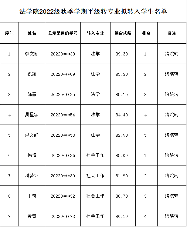 根据本科生院《关于开展2022级普通本科生秋季学期转专业工作的通知》、《jdb电子中国官方网站普通本科生专业分流与转专业管理办法(试行)》(长大校发[2019]260号)和《jdb电子中国官方网站2022级本科生秋季学期转专业实施方案》,经学生本人申请,本科生院资格审核,本院考核。按照综合成绩=必修课平均成绩*40%+面试成绩*60%,综合成绩分由高到低排序,经学院党政联席会议讨论通过以下9名同学为拟接收人员,现予以公示。