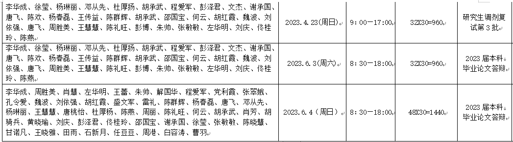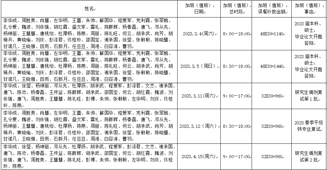 根据《jdb电子中国官方网站加班(值班)误餐补助管理办法(试行)》(长大校发【2019】83号)文件规定,现对我院3月4日--6月4日2023年转专业、研究生复试、论文答辩加班(值班)误餐情况进行公示。公示期为三天(6月5日-5月7日),如对加班(值班)误餐情况有异议,请在公示期内向院办反映(0716--8060329)。
