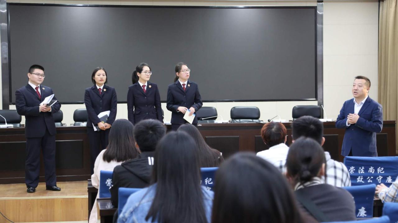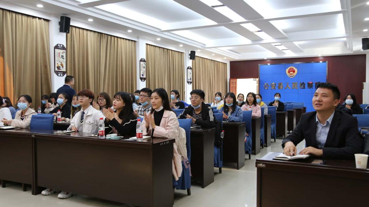 在会议室举行的交流会中,同学们观看了公安县人民检察院专题纪录片,并认真听取5位青年检察官对公安县人民检察院的介绍,其中提及扫黑除恶、认罪认罚从宽制度、公益诉讼等具体工作内容以及检察官们的个人经历和宝贵的学习与工作经验。王俊娥检察官谈到校园学习与事务办案之间的区别,指出学习是从事法律事业的基础,在学习上读、写、思需齐头并进。答疑环节,针对同学们提出的一些问题,青年检察官们一一作出了解答,并强调,在工作中不断学习,提高自己的能力,是解决困难和问题的关键。